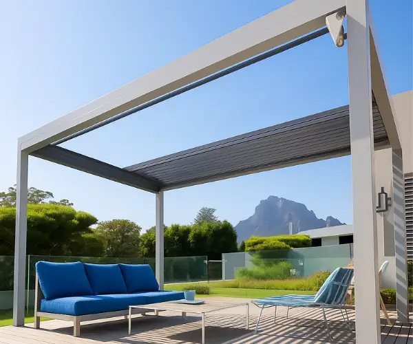 La pérgola bioclimática retráctil funciona de otra manera: las lamas se pliegan o deslizan hacia un lateral, dejando el espacio completamente abierto o completamente cerrado. No existe una posición intermedia. Esto la convierte en una opción excelente cuando quieres cielo despejado en primavera o otoño, pero la hace menos versátil para los días de calor intenso en que lo que necesitas no es abrir ni cerrar del todo, sino regular.